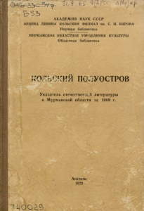 Кольский полуостров : указатель отечественной литературы о Мурманской области за 1969 год / Акад. наук СССР, Кол. фил. им. С. М. Кирова, Науч. б-ка, Мурм. обл. упр. культуры, Обл. б-ка ; сост.: М. Т. Беспалова, Л. В. Дрябезгова. - Апатиты : [б. и.], 1972. - 278, [1] с.