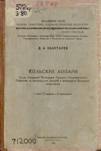 Золотарев, Д. А. Кольские лопари : труды Лопарской Экспедиции Русского Географического Общества по антропологии лопарей и великорусов Кольского полуострова / Д. А. Золотарев. - Ленинград : АН СССР, 1928. - 206 с., [2] л. карт. : диагр., фот. - (Материалы комиссии экспедиционных исследрваний ; вып. 9) (Серия Северная).