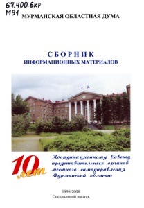 Мурманская область. Дума. Сборник информационных материалов : 10 лет Координационному Совету представительных органов местного самоуправления Мурманской области / Мурм. обл. Дума ; [отв. за вып.: Мельникова М. Н. и др.]. - Мурманск: Полиграфист, 2008. - 60, [24] с.: ил., портр.