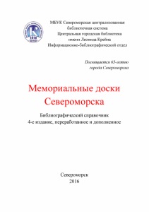 МБУК Североморская централизованная библиотечная система Центральная городская библиотека имени Леонида Крейна Информационно-библиографический отдел Посвящается 65-летию города Североморска Мемориальные доски Североморска Библиографический справочник 4-е издание, переработанное и дополненное Североморск 2016