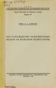 Борисов, П. А. Месторождение нефелиновых песков на Кольском полуострове / проф. П. А. Борисов. - Москва : издание Научно-технического управления ВСНХ, 1929 (Нижний Новгород : тип. "Нижполиграф"). - 64 с. : ил., черт., диагр., карт. - (Труды Института по изучению Севера / С.С.С.Р, Науч.- техн. упр. ВСНХ ; № 297 ; вып. 44).