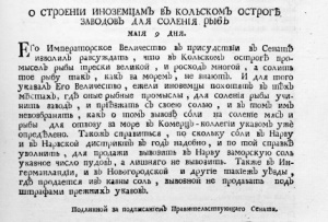 1723 г. мая 9. Подлинный за подписанием Правительствующего Сената. О строении иноземцами в Кольском остроге заводов для соления рыбы // Указы блаженныя и вечнодостойныя памяти государя императора Петра Великаго самодержца всероссийскаго : состоявшияся с 1714, по кончину его императорскаго величества, генваря по 28 число 1725 году / напечатаны по указу всепресветлейшей державнейшей великой государыни императрицы Анны Иоанновны самодержицы всероссийской. - В Санктпетербурге : При Императорской Академии наук, [1753]. – С. 647.