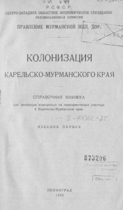 Колонизация Карельско-Мурманского края: справочная книжка для желающих водвориться на переселенных участках в Карельско-Мурманском крае/ РСФСР, Сев.-Зап. обл. экон. совещание, Колонизац. комиссия, Правление Мурм. ж.д. - 1-е изд. - Ленинград: [б.и.], 1925. - 30, [2] с., 1 л. карт.: ил.