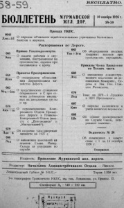 Бюллетень Мурманской железной дороги / Правление Мурм. ж. д. – Петрозаводск : Типо-Литография Мурманской железной дороги. 1926, № 58-59.