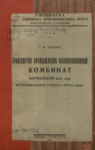 Чиркин, Г. Ф. Транспортно-промышленно-колонизационный комбинат Мурманской : его возникновение, развитие и метод работ/ Г.Ф. Чиркин ; Главнаука. - М. ; Л., 1928. - 134,[1] с., [2] л. схем, карт. - (Труды государственного научно-исследовательского института землеустройства и переселения; Т.9).