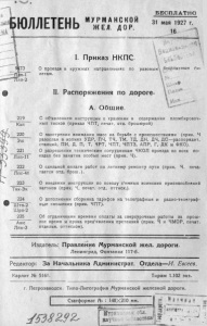 Бюллетень Мурманской железной дороги / Правление Мурм. ж. д. – Петрозаводск : Типо-Литография Мурманской железной дороги. 1927, № 16.