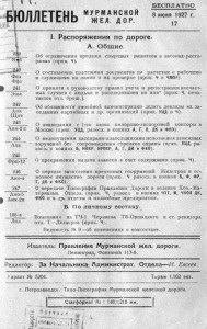 Бюллетень Мурманской железной дороги / Правление Мурм. ж. д. – Петрозаводск : Типо-Литография Мурманской железной дороги. 1927, № 17.