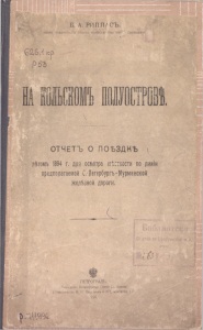 Риппас, Б. А. На Кольском полуострове : отчёт о поездке летом 1894 г. для осмотра местности по линии предполагаемой Санкт-Петербург-Мурманской железной дороги / Б. А. Риппас, чл. Инженер. совета М-ва путей сообщения. – Петроград : Типография Министерства путей сообщения (Товарищества И. Н. Кушнерев и К°), 1915. – [2], 84 с.