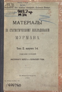 Материалы по статистическому исследованию Мурмана : [в 4 томах] / Ком. для помощи поморам русского Севера ; [под общ. ред. Н. В. Романова]. Описание колоний Восточного берега и Кольской губы. - Т.2. вып. 1. - 1902. -XIX, 273 с.: ил., табл.