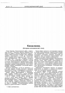 Кандалакша. (Историко-экономический этюд). Север Карелии—Кандалакшский район, соприка­ саясь на юге с Лоухским районом Карелии и упи­ раясь на севере в границы Мурманского округа— южные берега большого водоема озера Имандры, занимает пространство в 7.757 кв. километров. Часть площади района, примерно 20°/0, занята вод­ ными пространствами, 5О°/0 площади находится под лесом, 29°/0— болотами и тундрами и только 1°/0—под сельско-хозяйственн. угодиями *). Рельеф местности характеризуется преобладанием покры ­ тых лесом и кустарником и усеянных обточенными ледниками камнями возвышенностей—сельг, всхол­ мленных гривков вперемежку с болотными низмен­ ностями и озерами. Плотность населения— 1,4 на кв. километр, т. е. в 24 раза меньше средней плотности населения Европейской России, и приближается к плотности населения таких стран, как Швеция и Норвегия. Климат района представляется в следующем виде: средняя годовая -f- 0,3° С; самый холодный месяц—февраль, со средней месячной за 10 лет — — 12,7° С. Самый теплый — июль, средняя его 14,7° С, после июля следует август, средняя месячная которого 13,0° С, далее июнь с -f- 10,7° С. Вегетационный период—с июня (И половина) п о к а ­ чало сентября. Среднее количество осадков за 10 л е т—326 мм.; наибольшее количество их падает на июль и сентябрь. Господствующими ветрами являются северо-восточные и северные. t) Цифры ориентировочны е. Чрезвычайная краткость вегетационного периода и вообще неблагоприятные климатические условия для выращивания сельско-хозяйственных культур естественно устремляют внимание населения на изыскание иных источников существования, глав ­ нейшим из которых является рыболовство. Административно-хозяйственный и бытовой центр района—село Кандалакша (финское, в переводе на русский—конец, край залива), расположенное на восточной стороне Кандалакшского залива Белого моря, относится к числу древних северных поселе­ ний, окончательно сложившихся в результате бо яр ­ ской, промысловой колонизации „Господина Вели­ кого Но в го р о д а11. Любопытно остановиться немного на прошлом Кандалакши, на вопросе о времени ее возникно­ вения как поселенной единицы Поморья. В местной церкви Иоанна Предтечи, начатой постройкой в 1786 г. и представляющей из себя, правда, не совсем законченный (купол), но х ар а к ­ терный памятник типичного северного деревянного зодчества, хранится грамота епископа архангель­ ского и холмогорского Вениамина, датированная 1780 г. В ней епископ говорит: „Благословили мы по прошению Кольского уезда с. Кандалакши свя­ щенника Григория Плотникова с причетниками и прихожаны построить в том селе Кандалакша во имя Иоанна Предтечи на месте обветшалой новую деревянную ц ерко в ь1. Как видно из приведенного текста, существующая в настоящее время ц ерковь должна была бы быть начата постройкой в 1780 г.