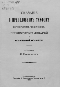 Сказание о преподобном Трифоне Печенгском чудотворце, просветителе лопарей и об основанной им обители / cост. Н. Корольков. – С.-Петербург : Тип. Е. Евдокимова, 1896. - 42 с. : ил.