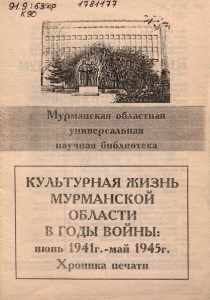 Культурная жизнь Мурманской области в годы войны: июнь 1941 г. - май 1945 г. : хроника печати : указатель литературы / [Мурм. обл. универс. науч. б-ка ; сост. Л. М. Дребская]. – Мурманск : Мурманская государственная областная универсальная научная библиотека, 1996. – 35, [3] с. : ил.