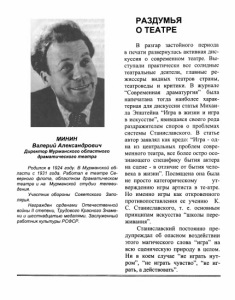 Минин, В. А. Раздумья о театре // Годы застойные... Годы достойные! : [сборник воспоминаний] / составители В. И. Горячкин, В. Ф. Костюкевич. – Мурманск, 2000. – С. 192-199.