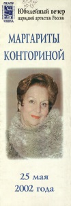 Юбилейный вечер народной артистки России Маргариты Конториной, 25 мая 2002 года / Драматический театр Северного флота ; [автор текста И. Сталинская]. – [Мурманск] : ЦНТИ, 2002. – 1 л. (слож. в 6 с.) : ил.