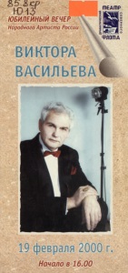 Юбилейный вечер народного артиста России Виктора Васильева, 19 февраля 2000 г. : [буклет] / Драматический театр Северного флота ; [автор текста Т. Чеснокова ; фото: М. Кадашников]. – Мурманск : Милори, 2000. – 1 л. (слож. в 6 с.) : ил., фот.