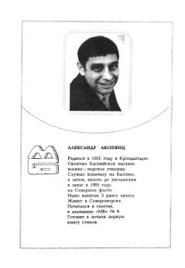 АЛЕКСАНДР АКОПЯНЦ Родился в 1951 году в Крондштадте. Окончил Каспийское высшее военно-морское училище. Служил поначалу на Балтике, а затем, вплоть до увольнения в запас в 1995 году, на Северном флоте. Ныне капитан 3 ранга запаса. Живет в Североморске. Печатался в газетах, в альманахе «МБ» № 6. Готовит к печати первую книгу стихов.
