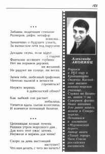 Акопянц, А. Э. «Забавна медитация стихами…» : [стихи] // Мурманский берег : литературный альманах / Мурм. орг. Союза рос. писателей. - Мурманск, 2007. - [Вып. 12]. - C. 185-191.