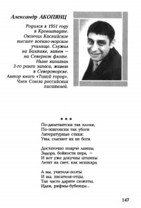 Александр АКОПЯНЦ Родился в 1951 году в Кронштадте. Окончил Каспийское высшее военно-морское училище. Служил на Балтике, затем — на Северном флоте. Ныне капитан 3-го ранга запаса, живет в Североморске. Автор книги «Тихий город». Член Союза российских писателей. Не * * По-дилетантски так плохи, По-эпигонски так убоги Литературные стихи: Увы, слагают их не боги. Достаточно поярче лампы, Задора, бойкости пера, — И вот уже докучны штампы Летят на свет, как мошкара. А вы, учителя-поэты И вы, писатели-отцы, Так часто дарите сюжеты, Идеи, рифмы-бубенцы... 147