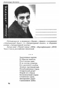 Александр Акопянц i Публиковался в журналах «Знамя», «Арион», в альманахе «Мурманский берег», в «Литературной газете», в сборнике юмора «уХитературной газеты». Автор книг «Тихий город» (2004), «Версификация» (2010). Член Союза российских писателей. it Задумчивых картин И образов ваятель, Поэт всегда один И не всегда понятен. Кто расплетёт клубок Земнв1х противоречий, Полублаженных строк, Осиротелой речи? Порой его стихов Косноязычный морок Стоически суров, Неотразимо дорог Сцеплением небес 96
