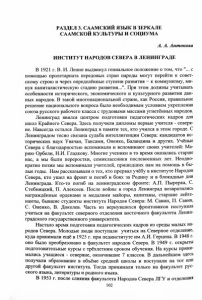 РАЗДЕЛ 3. СААМСКИЙ ЯЗЫК В ЗЕРКАЛЕ СААМСКОЙ КУЛЬТУРЫ И СОЦИУМА А. А. Антонова ИНСТИТУТ НАРОДОВ СЕВЕРА В ЛЕНИНГРАДЕ В 1921 г. В. И. Ленин выдвинул гениальное положение о том, что "... с помощью пролетариата передовых стран народы могут перейти к совет скому строю и через определённые ступени развития - к коммунизму, ми нуя капиталистическую стадию развития...". При этом должны учитывать особенности исторического, экономического и культурного развития дан ных народов. В такой многонациональной стране, как Россия, правильное решение национального вопроса было необходимым условием укрепления союза русского рабочего класса с трудовыми массами угнетённых народов. Ленинград явился центром подготовки педагогических кадров для школ Крайнего Севера. Здесь получили дипломы первые учителя - северя не. Навсегда остался Ленинград в памяти тех, кто учился в этом городе. С Ленинградом тесно связана судьба интеллигенции Севера: кандидатов ис торических наук Увачан, Таксами, Оненко, Баландина и других. Учёные Севера с благодарностью вспоминали и вспоминают своих учителей: Ма рию Орбели, Н.И. Гладкову. Многие ученики в то время оказались старше нас, а мы были переростки, семиклассники послевоенных лет. Неодно кратно позже мы вспоминали учителей, пришедших нам на помощь в бы лые годы. Нам рассказывали о тех, кто прервал учёбу в институте Народов Севера, кто ушел на фронт и погиб в боях за Родину и в блокадные дни Ленинграда. Кто-то погиб на ленинградском фронте: А.П. Пырерка, С. Стебницкий, П. Алексеев. После войны в город Ленинград возвратились награждённые орденами и медалями майоры, капитаны, старшие лейте нанты, бывшие студенты института Народов Севера: М. Савин, П. Савин, С. Оненко, В. Доколев. Часть из вернувшихся фронтовиков поступила учиться на факультет северного отделения восточного факультета Ленин градского государственного университета. Настало время подготовки педагогических кадров из среды малых на родов Севера. Молодые люди поступали учиться на Северное отделение, куда принимали ещё в 1925 г. при пединституте им А.И. Герцена. В 1948 г. оно было преобразовано в факультет народов Севера. В 1949 г. открыты подготовительные курсы с трёхлетним сроком обучения. На курсы прини мались учащиеся - северяне, окончившие 7 классов. В дальнейшем здесь получали образование в объёме средней школы и поступали на тот или другой факультет института. Тогда принимали только на факультет рус ского языка, литературы и родного языка. В 1953 г. после слияния факультета Народов Севера ЛГУ и отделения 102