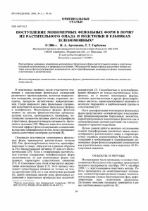 ЛЕСОВЕДЕНИЕ, 2006, № 3, с. 50-56 ___________________________________ ОРИГИНАЛЬНЫЕ __________ ____________________ СТАТЬИ УДК 630*114.2 ПОСТУПЛЕНИЕ МОНОМЕРНЫХ ФЕНОЛЬНЫХ ФОРМ В ПОЧВУ ИЗ РАСТИТЕЛЬНОГО ОПАДА И ПОДСТИЛКИ В ЕЛЬНИКАХ ЗЕЛЕНОМОШНЫХ* © 2006 г. Н. А. Артемкина, Т. Т. Горбачева Институт проблем промышленной экологии Севера Кольского НЦ РАН 184200 Апатиты, Мурманская обл., ул. Ферсмана, 14а E-mail:gorbacheya@inep.ksc.ru Поступила в редакцию 7.10.2005 г. Рассмотрена динамика изменения мономерных фенольных форм растительного опада и подстилки ельников зеленомошных в природных условиях. Обсуждаются парцеллярные различия в темпах по тери массы фенолсодержащих компонентов, пути трансформации мономерных форм, взаимосвязь с металлами и неметаллами. Фенолсодержащие компоненты, мономерные формы, растительный опад, подстилка, темпы по тери массы. В подстилках хвойных лесов отмечается тен денция к аккумуляции фенольных соединений различного происхождения, включая подкроно- вые выпадения, экстракты опада, корневые экс судаты, продукты метаболизма микроорганиз мов. Среди широкого ряда фенольных соедине ний выделяются мономерные фенольные формы и полифенолы. Мономерные формы фенолов влияют на многие физиологические процессы: деление клеток, проницаемость мембраны, по глощение элементов питания, синтез хлорофилла и протеинов, ферментативную активность, фото синтез, дыхание [19]. Широко известен аллелопа- тический эффект фенолсодержащих соединений: вследствие амфифильности они легко проникают сквозь клеточную мембрану растений [8]. Основным источником мономерных феноль ных форм признаются растительные остатки [18]. Так, фенол карбоновые кислоты, идентифи цируемые в опаде, образуются главным образом за счет биодеградации лигнина [27] или его фото деструкции [25]. Если в отмирающих раститель ных клетках содержание полифенольных форм увеличивается, то для мономерных форм, как правило, характерно существенное снижение [15]. В гумусовом слое почв отмечается аккуму ляция мономерных форм [13]. Этот процесс ока зывает существенное влияние не только на тем пы деструкции [23], но и ход химических реакций [6]. Давно признана важная роль фенольных со единений в педогенных процессах как хелатооб- *Работа выполнена при финансовой поддержке 1NTAS REF (012213), РФФИ (03-04-48628; 04-04-49131). разователей [7]. Способностью к хелатообразо- ванию обладают не только растительные поли фенолы, но и многие мономерные формы, особенно протокатеховая и другие фенолкарбо- новые кислоты, характеризующиеся наличием в молекуле гидроксила и карбоксильной группы в о-положении [11]. Пути трансформации мономерных фенольных форм представляют особый интерес в исследова нии функционирования бореальных экосистем, характеризующихся накоплением фенолов как в ассимилирующих органах растений, так и аккуму ляцией в горизонте подстилки. Целью данной работы являлось исследование темпов трансформации различных видов свеже- отобранного растительного опада в старовозра стных ельниках зеленомошных Кольского п-ва, тенденций в мобилизации и трансформации мо номерных форм фенолсодержащих компонентов как в растительном опаде, так и подстилке Al-Fe- гумусовых подзолов. ОБЪЕКТЫ И МЕТОДЫ Исследования были проведены в еловых био геоценозах Кольского п-ва в рамках трехлетнего полевого эксперимента (октябрь 1997 г.-октябрь 1999 г.) с использованием пакетного метода. Ра бо