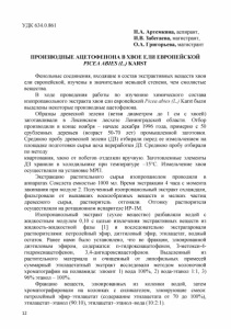 УДК 634.0.861 Н.А. Артемкина, аспирант, И.В. Забегаева, магистрант, О.А. Григорьева, магистрант ПРОИЗВОДНЫЕ АЦЕТОФЕНОНА В ХВОЕ ЕЛИ ЕВРОПЕЙСКОЙ PICEA ABIES (L.) KARST Фенольные соединения, входящие в состав экстрактивных веществ хвои ели европейской, изучены в значительно меньшей степени, чем смолистые вещества. В ходе проведения работы по изучению химического состава изопропанольного экстракта хвои ели европейской Picea abies (L.) Karst были выделены некоторые производные ацетофенона. Образцы древесной зелени (ветви диаметром до 1 см с хвоей) заготавливали в Лисинском лесхозе Ленинградской области. Отбор производили в конце ноября - начале декабря 1996 года, примерно с 50 срубленных деревьев (возраст 50-70 лет) промышленной заготовки. Среднюю пробу древесной зелени (ДЗ) отбирали перед ее измельчением на площадке подготовки сырья цеха переработки ДЗ. Среднюю пробу отбирали по методу квартования, хвою от побегов отделяли вручную. Заготовленные элементы ДЗ хранили в холодильнике при температуре -15°С. Измельчение хвои осуществляли на установке МРП. Экстракцию растительного сырья изопропанолом проводили в аппаратах Сокслета емкостью 1000 мл. Время экстракции 4 часа с момента закипания при модуле 2. Полученный изопропанольный экстракт охлаждали, фильтровали от выпавших воскообразных веществ и мелких частиц древесного сырья, растворитель отгоняли. Отгонку растворителя осуществляли на ротационном испарителе ИР-1М. Изопронанольный экстракт (сухое вещество) разбавляли водой с жидкостным модулем 0,10 с целью извлечения экстрактивных веществ из жидкость-жидкостной фазы [1] и последовательно экстрагаровали растворителями: петролейный эфир, диэтиловый эфир, этилацетат, водный остаток. Ранее нами было установлено, что во фракции, элюированной диэтиловым эфиром, содержатся: п-гидроксиацетофенон, З-метокси-4- гидроксиацетофенон, 3,4-дигидроксиацетофенон. Выделенный из растительного материала и очищенный от липофильных примесей суммарный этилацетатный экстракт исследовали методом колоночной хроматографии на полиамиде: элюент 1) вода 100%, 2) вода-этанол 1:1, 3) 96% этанол - 100%. Фракцию веществ, элюированных из колонки водой, затем хроматографировали на колонках с силикагелем, элюирующие смеси: петролейный эфир-этилацетат (содержание этилацетата от 70 до 100%), этилацетат-этанол (90:10), этилацетат-этанол-вода (10:2:1). 12