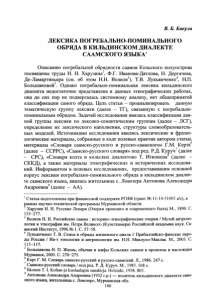 В. Б. Бакула ЛЕКСИКА ПОГРЕБАЛЬНО-ПОМИНАЛЬНОГО ОБРЯДА В КИЛЬДИНСКОМ ДИАЛЕКТЕ СААМСКОГО ЯЗЫКА' Описанию погребальной обрядности саамов Кольского полуострова посвящены труды Н. Н. Харузина , Ф.Г. Иванова-Дятлова, Н. Дергачева, Де-Ламартиньера (см. об этом Н.Н. Волков’), Т.В. Лукьянченко^, Н.П. Большаковой5. Однако погребально-поминальная лексика кильдинского диалекта недостаточно представлена в данных этнографических работах, она до сих пор не подвергалась системному анализу, нет общепринятой классификации самого обряда. Цель статьи - проанализировать данную тематическую группу лексики (далее —ТГ), связанную с погребально поминальным обрядом. Задачей исследования явилась классификация дан ной группы лексики по лексико-семантическим группам (далее - ЛСГ), определение их лексического наполнения, структуры словообразователь ных моделей. Источниками исследования явились лексические и фразео логические материалы, собранные в ходе полевых практик автором статьи, материалы «Словаря саамско-русского и русско-саамского» Г.М. Керта6 (далее - ССРРС), «Саамско-русского словаря» под ред. Р.Д. Ку|>уч7(далее - СРС), «Словаря колта и кольских диалектов» Т. Итконена (далее - СККД), а также материалы этнографических и исторических исследова ний. Информантом в полевых исследованиях, предоставившим основной корпус лексики погребально-поминального обряда в кильдинском диалек те саамского языка, явилась жительница с. Ловозера Антонова Александра Андреевна9(далее - АА). 1 Статья подготовлена при финансовой поддержке РГНФ (грант № 11-14-51005 а/с), в рамках научно-технической программы Мурманской области. Харузин Н. Н. Русские Лопари (Очерки прошлаго и современнаго быта) М., 1890. С. 155-277. 3 Волков Н. Н. Российские саамы : историко-этнографические очерки / Музей антропо логии и этнографии им. Петра Великого (Кунсткамера) Российской академии наук. Са амский Институт, 1996 № 1. С. 57-58. 4 Лукьянченко Т. В. Семья и обряды жизненного цикла // Прибалтийско-финские наро ды России / Ин-т этнологии и антропологии им. Н.Н. Миклухо-Маклая. М., 2003. С. 115-117. 5 Большакова Н. П. Жизнь, обычаи и мифы Кольских саамов в прошлом и настоящем Мурманск, 2005. С. 270-275. Керт Г. М. Словарь саамско-русский и русско-саамский. Л., 1986. 247 с. Саамско-русский словарь / под ред. Р. Д. Куруч. М., 1985. 568 с. * Itkonen Т. I. Koltan-ja kuolanlapin sanakiija. Helsinki, 1958. 803. Антонова Александра Андреевна (1932 г.р.) — носитель кильдинского диалекта саам ского языка, жительница с. Ловозеро, Мурманская обл. 106