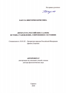 Бакула, В. Б. Литература российских саамов: истоки, становление, современное состояние : специальность 10.01.02 - Литература народов Российской Федерации (финно-угорская) : автореферат диссертации на соискание ученой степени доктора филологических наук / Бакула Виктория Борисовна ; научный консультант: доктор филологических наук, доцент Антонов Юрий Григорьевич ; Национальный исследовательский Мордовский государственный университет им. Н. П. Огарева. - Саранск, 2020. - 45 с.