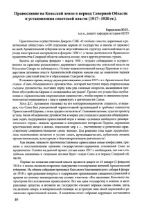 Православие на Кольской земле в период Северной Области и установления советской власти (1917-1920 гг.). Бардилева Ю.П., к.и.н., доцент кафедры истории МГГУ Практическое осуществление Декрета СНК «О свободе совести, церковных и ре­ лигиозных обществах» («Об отделении церкви от государства и школы от церкви») во всей Архангельской губернии из-за неустойчивости структур советской власти до ухода иностранных интервентов в феврале 1920 г.1, а также деятельности Временного правительства Северной области началось позже, чем в других регионах страны. Вплоть до середины февраля - марта 1920 г. четкого соблюдения и осущест­ вления на практике религиозного, церковного законодательства советской власти на Кольском Севере не наблюдалось. Основу взаимоотношений между Церковью и госу­ дарством духовные власти Архангельской епархии начали еще до появления первых декретов советской власти и образования Северной области. В сложное время, между двумя революциями, в июне 1917 г. в г. Архангельске был создан «Союз объединенного духовенства», который выступил перед епархиальным съездом духовенства, поставив перед ним ряд сложных вопросов, касающихся про­ блем обустройства Церкви в сложившейся ситуации2. Проект его устава был опубли­ кован в «Архангельских епархиальных ведомостях», чтобы миряне и священнослужи­ тели могли ознакомиться с ним и примкнуть к деятельности Союза. Хотя Д.С. Артамонов указывал на его контрреволюционную сущность, утверж­ дая, что Союз был реакционной черносотенной организацией и требовал главенства Православной Церкви, с этим трудно согласиться3. Главными целями, судя по проекту устава, были объединение духовенства и мирян для успешного решения общецерков­ ных задач, поддержания православной веры в новых «условиях свободного демокра­ тического строя», защиты правовых и материальных интересов Церкви, охранению христианских начал в жизни, изыскания мер к «... умственному и религиозно-нрав- ственному совершенствованию своих членов». Для решения этих задач предполага­ лось использовать печатное и устное слово, проповедничество, публичные лекции, просветительскую, культурную и благотворительную деятельность’. Как видим, никакого противопоставления православия иным конфессиям, при­ зыва к восстановлению прежних государственно-церковных отношений Союз не предполагал. Ссылка на данный проект устава июня 1917 г. необходима, так как с по­ добным названием и сходными целями будет создан Союз и в период Северной об­ ласти. Первые же попытки советской власти провести декрет от 23 января (2 февраля) 1918 г. в жизнь вызвали искреннее недоумение и возмущение жителей Архангельской губернии. На общем собрании прихожан Кольского Благовещенского собора 4 февра­ ля 1918 г. при решении вопроса о содержании прихожанами священнослужителей и храмов по новому законодательству коляне отметили: «Все население Кольского по­ луострова без исключения православное. Все мы даем государству и воинов, и мате­ риальные средства, и неужели же государство откажет верным сынам своим, здесь, на далеком севере, в материальной помощи на устроение ими своей церковной и ре­ лигиозно-нравственной жизни». В конечном итоге собрание верующих постановило 46