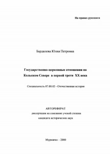 Бардилева, Ю. П. Государственно-церковные отношения на Кольском Севере в первой трети ХХ века : специальность 07.00.02 - Отечеств. история: автореф. дис. на соиск. учен. степ. канд. ист. наук / Ю.П. Бардилева. – Мурманск : [б.и.], 2000. -22 с. - На правах рукоп.