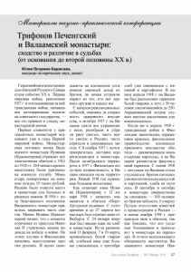 Трифонов Печенгский и Валаамский монастыри: сходство и различие в судьбах (от основания до второй половины XX в.) Юлия Петровна Бардилева, кандидат исторических наук, доцент Серьезнейшим испытанием для обителей Русского Севера стали события XX в.: Первая мировая война, революция 1917 г. и последовавшая за ней гражданская война, начавша яся антицерковная полити ка советского государства, — все это привело к упадку мо настырской жизни. Первые сложности у при граничных монастырей воз никают уже в годы Первой мировой войны. Монастыр ская летопись инока Вала амского монастыря Иувиана (Красноперова) отражает все злоключения обители с 1914 по 1920 гг. 264 монастырских насельника были призваны на военную службу. Мона стырь пожертвовал на воен ные нужды 10 тысяч рублей. Решено было отвести место в монастыре для больных и раненых воинов. В 1916 г. из- за бедственного положения Валаамского монастыря при шлось закрывать часть ски тов. Монах Иувиан (Красно- перов) пишет, что с момента отречения от престола Нико лая II утратилась всякая на дежда на победу в войне. По этому случаю в Финляндии начались выступления про тив русских. В целях само защиты на колокольне уста новили сменный дозор из братии, по ночам устроили караул из тех, кто мог дер жать оружие и владел им. С началом революционных событий, опасаясь за сохран ность церковного имуще ства, в октябре 1917 г. на Ва лааме сняли все украшения с икон, разобрали и убра ли раку святых, часть все го увезли в Россию, часть спрятали в сокровенных ме стах. С 8 ноября 1917 г. почти прекратилась доставка кор респонденции в монастырь. После октябрьского перево рота в 1917 г. Финляндия по лучила независимость, и Ва лаам оказался на ее террито рии. Новый 1918 год принес еще большие испытания. Как отмечает инок Иуви- ан (Красноперов), с 12 ян варя 1918 г. началось зна менитое в обители «Порт- Артурское сидение». С этого времени и до 27 апреля мо настырь был отрезан даже от Выборга. С 24 января впер вые был введен паек на хлеб в монастыре. Из-за реквизи ций 13 февраля, 7 и 10 марта, проведенных белой гварди ей, хлебный паек еще боль ше уменьшился, с сентября хлеб уже смешивался с мя киной и картофелем. В на чале апреля 1918 г. на Валаа ме был расположен гарнизон белой гвардии, к лету с 50 че ловек увеличившийся до 250. Авраамиевский остров слу жил местом заключения для военнопленных. Когда же в апреле 1918 г. гражданская война в Фин ляндии закончилась пораже нием красных, финляндское правительство поспешило присвоить имущество оби тели — реквизировали мона стырские пароходы, а на Ва лааме разместили финлянд ский гарнизон. С осени 1918 г. ситуация на Валааме стала ухудшаться. Братия питалась уже исключительно капустой и картошкой, хлеба не оста лось. В сентябре и октябре в монастыре свирепствова ла «испанка» — 100 человек из братии заболело, 6 умерло. Пугало отсутствие известий о происходящем в России — в конце ноября 1918 г. пре кратили звон в обители, так как боялись, что его услы шат большевики и приплы вут в монастырь на парохо дах. В отчете исполняющего обязанности настоятеля Ва лаамского монастыря Пав Под сенью Трифона | №1 Январь 2011 37
