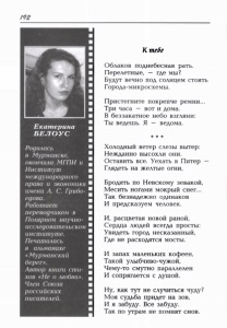 Белоус, Е. В. К тебе ; «Холодный ветер слезы вытер…» ; Крик : стихи // Мурманский берег : литературный альманах / Мурм. орг. Союза рос. писателей. - Мурманск, 2007. - [Вып. 12]. - C. 192-196.