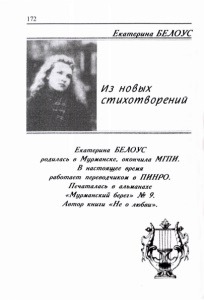 Белоус, Е. В. Из новых стихотворений // Мурманский берег : литературный альманах / Мурм. орг. Союза рос. писателей. - Мурманск, 2005. - № 10. - С. 172-175 : фот.