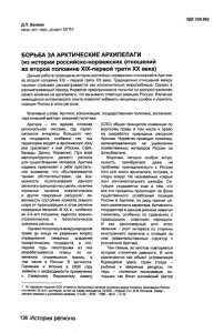 Д.П. Беляев канд. ист. наук, доцент МГПУ БОРЬБА ЗА АРКТИЧЕСКИЕ АРХИПЕЛАГИ (из истории российско-норвежских отношений во второй половине XIX-первой трети XX века) Данная работа посвящена истории российско-норвежских отношений в Арктике во второй половине XIX - первой трети XX века. Традиционно отношения между нашими странами рассматриваются как исключительно миролюбивые. Однако в рассматриваемый период Норвегия предпринимала попытки по распространению своего влияния на архипелаги, что вызывало ответную реакцию России. Изучение имеющегося исторического опыта позволит избежать ненужных ошибок и укрепить позиции России в этом регионе. Ключевые слова: Арктика, колонизация, «арктический вектор» внешней политики. Арктика - это единая сложная региональная система, где переп летаются интересы большого чис ла государств, особенно тех, чьи территории входят в арктическую зону или прилегают к ней (России, США, Канады, Дании, Норвегии). При всей малопригодности данного региона для существования человека, Арктика издавна привлекает к себе присталь ное внимание, что обуславливается такими обстоятельствами, как воз можность использования данного региона втранспортных целях, наличие огромных запасов энергетических и других природных ресурсов1, за висимость состояния климата земного шара от происходящих в этом регионе природных явлений. В XX в., особенно во 2-й его половине, выросло военно стратегическое и геополитическое значение региона. Однако поскольку вмеждународном праве до конца не разрешен вопрос определения северных владений приарктических государств, в пос ледние годы некоторыми из них разрабатываются планы по из менению сложившихся границ, в том числе и России. В частности, Германия и Япония в 2000 году заявили о необходимости применения к Северному Ледовитому океану государственная политика, экспансия, (СЛО) общих принципов конвенции по морскому праву, в том числе и право на разработку природных ресурсов Арктики. Норвегия проводит политику, целенаправленную на ущемление хозяйственных интересов России на Шпицбергене. Впрочем, сегодня особую актуа льность приобретают даже не проблемы принадлежности к России того или иного архипелага, острова, а споры вокруг так называемых «серых зон» континентального шельфа. Си туация ухудшается еще и тем, что все эти процессы происходят на фоне существенного ослабления позиций России в Арктике, по ряду причин са мого различного характера. Активность государства в данном регионе заметно снизилась, особенно по сравнению с предыдущим, советским периодом. И как закономерный итог этого явления - рост интереса со стороны иностранного капитала и стоящих за ним правительственных структур к российской Арктике. Тем самым, во многом повторяется история столетней давности. И хотя различаются как объект устремлений борющихся здесь стран (тогда - рыбные и звериные ресурсы, те перь - полезные ископаемые, ко торыми так богат российский сектор 1 По недавним оценкам ООН стоимость балансовых запасов основных видов полезных ископаемых России составляет 28 трлн. долларов, из них на Север приходится 70-80%. / Агранат Г.А., B.M. Котляков. Север - зеркало мировых и российских проблем. // США - ЭПИ. -1996. - №12. - C.10. 136 История региона