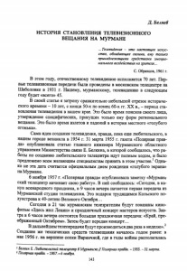 Д. Беляев ИСТОРИЯ СТАНОВЛЕНИЯ ТЕЛЕВИЗИОННОГО ВЕЩАНИЯ НА МуРМАНЕ ...Телевидение - это настоящее искус ство, обладающее своими, ему только принадлежащими средствами эмоцио нального воздействия на зрителя... С. Образцов, 1961 г. В этом году, отечественному телевидению исполняется 70 лет. Пер вые телевизионные передачи были проведены в московском телецентре на Шаболовке в 1931 г. Нашему, мурманскому, телевидению в следующем году будет «всего» 45. В своей статье я затрону сравнительно небольшой отрезок историче ского времени - 10 лет, с конца 50-х по конец 60-х гг. XX в., - период ста новления телевидения в нашем крае. Это было время поисков своего лица, утверждение специфических, присущих только ему форм регионального вещания. Это было время взлетов и падений в истории местного «голубого огонька». Сама идея создания телевидения, правда, пока еще любительского, в нашем городе возникла в 1954 г. 31 марта 1955 г. газета «Полярная прав да» опубликовала статью главного инженера Мурманского областного управления Министерства связи Е. Белкина, в которой сообщалось, что ра боты по созданию любительского телецентра идут полным ходом, и было предложено всем желающим специалистам принять в этом участие.1Одна ко не эта дата считается официальным днем рождения «голубого экрана» на Мурмане. 6 ноября 1957 г. «Полярная правда» опубликовала заметку «Мурмант ский телецентр начинает свою работу». В ней сообщалось: «Сегодня, в ка нун всенародного праздника, в 9 часов вечера начнется первая передача из Мурманской студии телевидения. Это подарок трудящимся Кольского по луострова к 40-летию Великого Октября... Сегодня в 21 час мурманским телезрителям будут показаны кино фильм «Здесь жил Ленин» и праздничный концерт мастеров искусств. Зав тра в 6 часов вечера состоится большая праздничная передача: «Край, пре ображенный Октябрем». Затем будет передан концерт... В дальнейшем телепередачи будут производитьсядва раза в неделю».2 Создание же технических средств телевещания началось годом ранее: в мае 1956 г. на вершине сопки Варничной, где в годы войны располагалась 1Белкин Е. Любительский телецентр в Мурманске// Полярная правда. - 1955. - 31 марта. 2Полярная правда. - 1957. - 6 ноября. 143