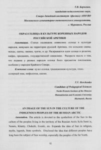 Берченко, Т. В. Образ солнца в культуре коренных народов Российской Арктики / Т. В. Берченко // Современные тенденции инновационного развития Европейского Севера : материалы региональной научно-практической конференции, Мурманск, 22 марта 2019 года / редакционная коллегия: Сахневич Т. А., канд. пед. наук [и др.]. - Мурманск, 2019. – С. 92-103.