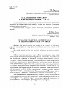 УДК 801.331 ББК81.2 Т.В. Берченко Северо-Западный институт Московского гуманитарно-экономического университета г. Мурманск, Россия РОЛЬ ЭРГОНИМОВ МУРМАНСКА В ФОРМИРОВАНИИ ИМИДЖА ГОРОДА Аннотация, В статье излагаются результаты исследования эргонимов г. Мурманска в аспекте отражения имиджа города, его истории, экономики, особенностей климата и т.п. Ключевые слова: специфика города, топонимы, ономастика, эргонимы, нейминг. Т. V Berchenko North-Western Institute o fMoscow Humanitarian and Economic University Murmansk, Russia MURMANSK JERGONIMS AND THEIR ROLE IN THE FORMATION OF THE CITY IMAGE Abstract. This article presents the results o f the research o f Murmansk jergonim s as they reflect the image o f the city, its history, economics, climate condi tions, etc. Key words: specific o f the city, toponym, urbanonim, jergonim , onomastic naming. Сейчас Мурманск усиленно ищет себя в изменившемся мире. Мур манск может стать городом моряков и рыбаков, нефтяной и газовой столи цей, форпостом Арктики в Заполярье. Назрела необходимость сделать Мурманск туристическим центром: развитие сферы туризма является эф фективным инструментом диверсификации экономики города, формиро вания дополнительных рабочих мест, удовлетворения деловых, социально культурных и рекреационных потребностей жителей и гостей города. Му ниципальная программа города Мурманска «Развитие конкурентоспособ ной экономики» на 2014—2018 гг. предполагает «создать условия для фор мирования имиджа муниципального образования город Мурманск как го рода, открытого для бизнеса и привлекательного для инвестиций» [1]. Для формирования привлекательного имиджа города необходимо не только развивать достоинства города, но и правильно их преподнести, ог ромную роль в этом процессе играет ономастика города. В ономастике го рода отражается его специфика, формируется имидж города. 130