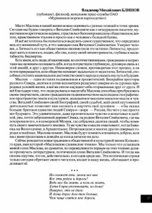 ВладимирМихайлович БЛИНОВ (публицист, философ, начальник пресс-службы ОАО «Мурманское морское пароходство») Место Маслова в нашей жизни можно оценивать с разных позиций и точек зрения. Сегодня мы будем говорить о Виталии Семёновиче как о незаурядном писателе, му жественном арктическом моряке, страстном и бескомпромиссном общественном дея теле, нравственном эталоне и просто как о человеке с большой буквы. И всё же хотелось бы попытаться выделить самое существенное, что определяло весь его жизненный путь, и что завещано нам Виталием Семёновичем. Умирает чело век, а Личность его как общественное явление (если это истинно Личность), продол жает жить и помогать людям, ибо она, в силу своей неповторимости, глубины и масш табности, бессмертна. Есть земля, естьлюди, еёнаселяющие, но соотечественниками, гражданами ипатрио тами мы начинаем осознавать себя, когда почувствуем глубинную, духовную связь и с этой землёй, и друг с другом. Неимоверно сложен, противоречив этот процесс, и он почти прекращается, если общество начинает задыхаться от недостатка Личностей, спо собных отстоять национальноедостоинство своего народа и указать ему путь в будущее. Маслов — один из таких подвижников и просветителей. Бескрайни просторы русского Севера, десятки и сотни километров разделяют северян из-за суровых при родных условий жизни, и всё же они не ощущают себя оторванными друг от друга. И всё благодаря тому, что люди размаха и масштаба Маслова способны преобразовать своим творчеством, своим гражданским подвижничеством малолюдное географичес кое пространство земли в культурное, насыщенное высоким накалом мысли и чув ства. Виталий Семёнович своей биографией, своей судьбой, всей своей неутомимой деятельностью позволяет нам осознать и ощутить своё духовное — я бы сказал больше: братское единство людей Севера и - шире — России, без чего у нас просто нет будущего. Это удивительное, даже пронзительное чувство я испытывал в далё кой, увы, почти заброшенной деревне Сёмжа, на родине Виталия Семёновича, где мы похоронили его, и в поморской Мезени, где собрались десятки людей, чтобы помя нуть своего замечательного земляка. Те же чувства и мысли охватывают, когдабыва- ешь на Вологодчине, в Архангельске, Петрозаводске и многих других северных го родах и посёлках. Маслова помнят, Маслова будут помнить и поминать добром, если мы с вами продолжим и доведём до конца начатое им дело. Сейчас рождается новая традиция в общественной и культурной жизни Кольско го края, имя которой «Масловские славянские чтения». Мы только что услышали живой голос Маслова, но думается, по справедливости первым на этих чтениях долж но прозвучать литературное, поэтическое слово Виталия Семёновича. И тогда мы сполна ощутим, что он, действительно, и сегодня среди нас. Эти поэтические строки только сегодня обретают своего читателя, входят в нашу жизнь, обогащают и про должают её. * * * Но скажет кто, зачем же мне Все эти рейсы и дороги? Ведь мог бы жить, а коль не жить. Хотя б присутствовать, но дома! Наверно, это не дано: И дома дорог дом тем больше. Чем чаще снятся мне дороги.