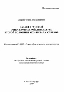 Бодрова, О. А. Саамы в русской этнографической литературе второй половины XIX - начала XX веков : автореферат дисcертации ... кандидата исторических наук : специальность 07.00.07 - Этнография, этнология и антропология / Бодрова Ольга Александровна ; [науч. рук.: Разумова Ирина Алексеевна ; Музей антропологии и этнографии им. Петра Великого (Кунсткамера) РАН]. - Санкт-Петербург, 2009. - 18 с.