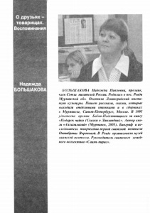 О друзьях - товарищах. Воспоминания Надежда БОЛЬШАКОВА БОЛЬШАКОВА Надежда Павловна, прозаик, член Союза писателей России. Родилась в пос. Ревда Мурманской обл. Окончила Ленинградский инсти­ тут культуры. Пишет рассказы, сказки, которые выходили отдельными книжками и в сборниках в Мурманске, Санкт-Петербурге, Москве. В 1995 удостоена премии Баёва-Подстаницкого за книгу «Подарок чайки (Сказки о Лапландии)». Автор кни­ ги «Алхалалалай» (Мурманск, 2003). Биограф и ис­ следователь творчества первой саамской поэтессы Октябрины Вороновой. В Ревде организовала музей саамской поэтессы. Руководитель саимского семей­ ного коллектива «Саамь пирас».