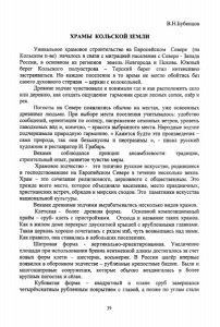 В.Н.Бубенцов ХРАМЫ КОЛЬСКОЙ ЗЕМЛИ Уникальное храмовое строительство на Европейском Севере (на Кольском п-ве) началось в связи с миграцией населения с Северо - Запада России, в основном из регионов земель Новгорода и Пскова. Южный берег Кольского полуострова - Терский берег стал интенсивно застраиваться. Но каждое поселение в то время не могло обойтись без своего духовного стержня - церкви с колокольней. Древние зодчие чувствовали и понимали где и как расположить село или деревню, как создать ощущение гармонии среди лесных сопок, озёр и рек. Погосты на Севере появлялись обычно на местах, уже освоенных древними людьми. При выборе места поселения учитывалось: удобство сообщений, ориентация по солнцу, направление сезонных ветров, уровень паводковых вод и, конечно, - красота выбранного места. Народные зодчие подчеркивали природную гармонию. « Кажется будто эти произведения - сама природа, так они безыскусны и неотразимы », - писал русский художник и реставратор И. Грабарь. Веками • соблюдался принцип ансамблевости: традиции, строительный опыт, развитое чувство меры. Храмовое зодчество - это типично русское искусство, родившееся и господствовавшее на Европейском Севере в течение несколько веков. Храм - это сочетание религиозного, церковного с общественным. Это прежде всего место, которое объединяло население, место праздничных, христианских встреч, обрядов и мирских сходов. Это памятники искусства национальной культуры. Веками древними зодчими вырабатывались несколько видов храмов. Клетская - более древняя форма. Основной композиционный приём - сруб- клеть с пристройками. Отсюда и название таких храмов. Как в жилом доме перекрыт двускатной крышей с врубленными главками. Такая церковь хорошо сочеталась с рядом изб, чуть возвышаясь над ними. Как правило, она ставилась в небольших поселениях. Шатровая форма - вертикально-ориентированная. Увеличение площади при использовании бревна неизменной длины достигалось за'счет новых форм клети - шестерик, восьмерик. В России шатёр впервые появился в оборонном зодчестве - рубленные крепостные башни. Были и многошатровые сооружения, которые обычно воздвигалась в более крупных погостах и сёлах. Кубоватая форма - квадратный в плане сруб завершался четырёхскатным рубленным покрытием с главой, а позже по углам стали 39