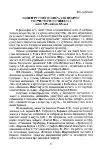 В.Н. Бубенцов ПЛЕНЭР РУССКОГО СЕВЕРА КАК ПРЕДМЕТ ТВОРЧЕСКОГО ПОСТИЖЕНИЯ (конец XIX - начало XX вв.) В философии есть такой термин «семантическое поле». В изобрази тельном искусстве, как и в других видах искусства, эти поля неравновели ки по своему значению. В пленэрной живописи северо-запада Российског о Севера значение этого понятия представляет особый интерес, т.к. сферы культурного творчества народов Севера, его субэтноса, тесно переплета ются. Так на его пленэрную живопись повлиял огромный интерес научно географических открытий в арктических просторах. Первые художники, появившиеся в Арктике: на Новой Земле в со ставе экспедиции К. Бэра в 1837 году находился художник Х.Д. Редер, на писавший картину «У входа в Маточкин Шар»; ученик Академии Худо жеств Е.И. Столица участвовал в походе «Ермака» в Северный Ледовитый Океан. Московские художники: В.В.Переплётчиков знал Кемь и Канда лакшу, а А.Е. Архипов писал свои любимые места - деревеньки на Бело- морье, в Архангельской губернии на Северной Двине. Н.В. Пинегин - географ, маринист, писатель. Перед тем, как окончил Академию художеств в Петрограде (1916) в 1909 побывал на Кольском по луострове - на р. Туломе, Айновых островах, в Коле, Печенге, Нотозере. Участник экспедиции Г.Я. Седова 1912-1914 на шхуне «Святой Фока», в 1924-1934 работал в арктических экспедициях в Баренцевом море на ледо коле «Малыгин». Известны остро подмеченные сюжеты в его картинах: «Святой Фока» во льдах», «Суровые берега Северной Земли». Сочетание первооткрывателя Севера и творческое постижение, а значит и воплощение увиденного, характерно для многих художников, побывавших в Заполярье. Писать, делать съёмки берега, собирать коллек ции - принести пользу и искусству, и науке, - так обозначил свою цель в жизни Борисов. По ходатайству министра финансов России С.Ю. Витте русские ху дожники А.А. Борисов, В.А. Серов и К.А. Коровин побывали на Кольской земле и в Норвегии, поработали на побережьях Белого, Баренцева и Нор вежского морей в августе 1894 г. По материалам этой поездки Коровин создал колоритные пейзажи: «Святой Нос», «Полночное солнце на Мур- мане», «Становище Териберка», Екатерининская гавань», «Трифонов ру чей», «Церковь, Бориса и Глеба», «Трифоно-Печенгский монастырь» и др., хранящиеся сейчас в Третьяковской галерее. В 1896 г. его работы состави ли экспозицию павильона «Крайний Север» Всероссийской выставки в Нижнем Новгороде (серия его декоративных работ на заполярную тему сейчас в экспозиции Третьяковской галереи). 67