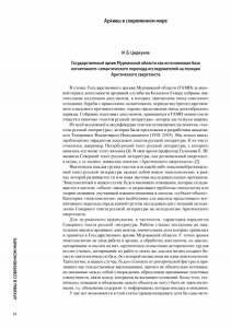 АРХИВЫ В СОВРЕМЕННОМ МИРЕ Архивы в современном мире И. Б. Циркунов Государственный архив Мурманской области какисточниковая база когнитивного-семантического перехода исследователей на позиции Арктического сверхтекста В стенах Государственного архива Мурманской области (ГАМО) за веко­ вой период деятельности архивной службы на Кольском Севере собраны зна­ чительные коллекции документов, в которых запечатлена эпоха советского созидания, борьбы с вражескими захватчиками, периода внутригосударствен­ ного классового противостояния, хорошо представлена эпоха дооктябрьского периода. Собрание текстовых документов, хранящихся в ГАМО можно смело отнести к понятию «текстов русской литературы», которое мы толкуем широко. Из всей возможной классификации текстов остановимся на понятии «тек­ стов русской литературы», которая была предложена и разработана академи­ ком Топоровым Владимиром Николаевичем (1928-2005). Мы имеем ввиду проблематику парадигмы локальных текстов русской литературы. К их числу относится, например, Петербургский текст русской литературы, с которого началось изучение этого явления [4]. В свое время профессор Галимова Е. Ш. выявила Северный текст русской литературы, как региональный сверхтекст, а позже, с ее подачи, появилось понятие «Арктического сверхтекста» [2]. Фактически каждая группа текстов или какой-либо локальный/региональ­ ный текст русской литературы являют собой новую эпистемологию, в рам­ ках которой развивается та или иная научная исследовательская программа. Эпистемологией в нашем случае будем именовать отношения, которые склады­ ваются в системе «объект-знание» и затрагивают проблемы гносеологии или теории познания, изучающей взаимоотношения в системе «субъект-объект». Категория «эпистемология» нам необходима для анализа предстоящего ког­ нитивного перехода определенной группы исследователей с позиций методо­ логии Северного текста русской литературы на методологию Арктического сверхтекста. Для мурманского краеведения, в частности, характерна парадигма Северного текста русской литературы. Работы ученых построены на тща­ тельном анализе архивных документов, значительная доля которых хранилась и хранится в Государственном архиве Мурманской области. С точки зрения эпистемологии не сама работа в архиве, а обработка документов, их анализ, цитирование и ссылки на них, критическое осмысление исторических трудов коллег-ученых, цитирование их работ и, опять же, ссылки на них создают бо­ гатую тавтологическую базу, без которой немыслима ни одна эпистемология. Тавтологию, в нашем случае, будем отличать от риторической фигуры и при­ знавать как тождественные высказывания, причем не обязательно истинные, но связанные между собой утверждения, образующие признанные текстовые совокупности, связи между которыми не вызывают сомнений. Более того, тех­ нически, описание и объяснение одного объекта не могут быть не тавтологич­ ными, т.е. объяснение содержит ту информацию, которая имелась в описании. У нас нет возможности в этой статье проанализировать хотя бы одно исто­ 14