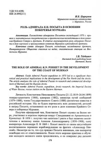 УДК 910.4(98) ББК 26.890(211) И.Б. Циркунов Мурманское книжное издательство г. Мурманск, Россия РОЛЬ АДМИРАЛА К.Н. ПОСЬЕТА В ОСВОЕНИИ ПОБЕРЕЖЬЯ МУРМАНА Аннотация. Руководство адмиралом Посьетом экспедицией 1870 г. при вело к значительным теоретическим и практическим последствиям в деле освое ния Крайнего Севера и Арктики. В статье анализируется роль адмирала Посье- та в деле научного и промыслового освоения Мурмана и российской Арктики. Ключевые слова: Адмирал Посьет, экспедиция, исследование Арктики, Императорское Общество спасения на водах, спасательная станция на Вос точном Мурмане. I.B. Tsirkunov Murmansk book publishing house Murmansk, Russia THE ROLE OF ADMIRAL K.N. POSSIET IN THE DEVELOPMENT OF THE COAST OF MURMAN Abstract. Guide Admiral Possiet expedition in 1870 led to a significant theo retical and practical implications in the development o f the Far North and the Arctic. The article analyzes the role o f Admiral Possiet in research and commercial develop ment o fMurman and the Russian Arctic. Key words: Admiral Possiet, expedition, Arctic research, the Imperial Society o f Water Rescue, rescue station on the Eastern Murman. Личность Константина Николаевича Посьета (21.12.1819-26.04.1899) генерал-адъютанта (1866), адмирала (1882), министра путей сообщений (1874-1888), члена Государственного Совета (1888) достаточно известна в российской истории. Мы не будем перечислять всех должностей, регалий и наград Посьета, остановимся на его роли в деле освоения Крайнего Се вера и побережья Мурмана. Получив офицерский чин, Константин Посьет служил на Белом мо ре, участвовал в морском переходе вокруг Скандинавии из Архангельска в Кронштадт. В 1858 г. получил чин капитана I ранга и был назвачен воспи тателем к великому князю Алексею Александровичу (1850-1908), сыну императора Александра II. В 1868 г. Посьет вместе со своим августейшим воспитанником пережили кораблекрушение на фрегате «Александр Нев ский». Несмотря на то, что суд признал Посьета виновным, сам император освободил его от ответственности. После этого морская практика и обуче ние молодого великого князя продолжились, и он совершил ряд дальних 278