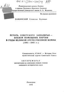 Дащинский, С. Н. Печать Советского Заполярья - боевой помощник партии в годы Великой Отечественной войны (1941-1945 гг.) : специальность 07.00.01 – История Коммунистической партии Советского Союза : автореферат диссертации на соискание ученой степени кандидата исторических наук / Дащинский Станислав Наумович. - Ленинград, 1979. - 20 с.