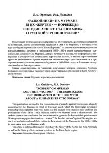 Е.А. Орехова , Р.А. Давыдов «РАЗБОЙНИКИ» НА МУРМАНЕ И ИХ «ЖЕРТВЫ» — НОРВЕЖЦЫ: ЕЩЕ ОДИН АСПЕКТ СТАРОГО МИФА О РУССКОЙ УГРОЗЕ НОРВЕГИИ? В настоящей публикации рассматриваются обстоятельства разбойных нападений на норвежцев, якобы совершенных русскими в 1868 г. на Мурмане, о которых в том году сообщала норвежская газета “Finmarksposten”. На основе источников российских государственных архивов и публикаций 1870-1880-х годов характеризуется кри минальная активность на Мурмане. Авторы приходят к выводу, что информация, при веденная в русофобской публикации норвежской газеты, о тяжких преступлениях «русских разбойников» против норвежцев не соответствует действительности, а пре ступники и потерпевшие в колониях Мурмана в 1860-1880-х годах в большинстве слу чаев вообще не были русскими. Статья ориентирована на читателей, изучающих историю освоения Арктики, Кольского полуострова, а также историю международных отношений в Евро-Арктиче ском регионе. Ключевые слова: Мурман, норвежцы, колонисты. Е.А. Orekhova, R.A. Davydov “ROBBERS” ON MURMAN AND THEIR “VICTIMS” — THE NORWEGIANS: ONE MORE ASPECT OF THE OLD MYTH ABOUT A RUSSIAN THREAT TO NORWAY? This publication devoted to the circumstances of assaults against Norwegians allegedly committed by the Russians in 1868 on Murman coast, which the Norwegian newspaper Finmarksposten reported that year. Based on the sources from Russian state archives and publications of the 1870s-1880s, criminal activity on Murman coast is characterized. The authors come to the conclusion that the information, given in the Russophobic publication in Norwegian newspaper about serious crimes of “the Russian robbers” against Norwegians was not true, and criminals and their victims in the colonies of the Murman in the 1860s-1880s, in most cases, were not Russians at all. The article is intended for readers who study the history of the Arctic, the Kola Peninsula, as well as the history of international relations in the Euro-Arctic region. Keywords: Murman, Norwegians, colonists.