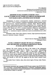 Давыдов Р. А. Дневник Павла Ильича Буркова 1915 года как источник по истории российско-норвежской торговли в Евро-Арктическом регионе // Мурман и Российская Арктика: прошлое, настоящее, будущее : материалы межрегиональной научной конференции, 26–28 сентября 2016 года / Мурм. аркт. гос. ун-т [и др.]. - Мурманск, 2016. - С. 197–212.