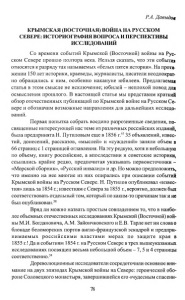Р.А. Давыдов КРЫМСКАЯ (ВОСТОЧНАЯ) ВОЙНА НА РУССКОМ СЕВЕРЕ: ИСТОРИОГРАФИЯ ВОПРОСА И ПЕРСПЕКТИВЫ ИССЛЕДОВАНИЙ Со времени событий Крымской (Восточной) войны на Рус ском Севере прошло полтора века. Нельзя сказать, что эти события относятся к разряду так называемых «белых пятен истории». На протя жении 150 лет историки, краеведы, журналисты, писатели неоднократ но обращались к ним, особенно накануне юбилеев. Предлагаемая статья в этом смысле не исключение; юбилей - неплохой повод для осмысления прошлого. В настоящей статье мы представим краткий обзор отечественных публикаций по Крымской войне на Русском Се вере и обозначим возможные направления для дальнейших исследо ваний. Первая попытка собрать воедино разрозненные сведения, по священные интересующей нас теме из различных российских изданий, была предпринята Н. Путиловым еще в 1856 г.5735 объявлений, извес тий, донесений, рассказов, «мыслей» и «суждений» заняли объем в 66 страниц с 1 страницей оглавления. На эту редкую, хотя и небольшую по объему, книгу российские, а впоследствии и советские историки, ссылались крайне редко, предпочитая указывать первоисточники - «Морской сборник», «Русский инвалид» и др. Но можно предположить, что именно на нее многие из них опирались при описании событий Крымской войны на Русском Севере. Н. Путилов опубликовал «извес тия» лишь за 1854 г.; известиям с Севера за 1855 г., вероятно, должен был соответствовать отдельный том, который по каким-то причинам так и не был опубликован.58 Вряд ли можно назвать простым совпадением то, что в наибо лее объемных отечественных исследованиях Крымской (Восточной) вой ны М.И. Богдановича, А.М. Зайончковского и Е.В. Тарле нет ни словао блокаде беломорских портов англо-французской эскадрой и предпри ним аемы х ро ссий ским и властями мерах по защ ите края в 1855 г.!Да и событиям 1854 г. на Русском Севере в трех вышеуказанных исследованиях посвящен весьма небольшой объем - 7, 5 и 4 страницы соответственно.59 Дореволюционные исследователи сосредоточили основное вни мание на двух эпизодах Крымской войны на Севере: героической обо роне Соловецкого монастыря, завершившейся его «чудесным спасени 78
