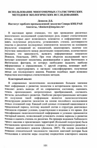 ИСПОЛЬЗОВАНИЕ МНОГОМЕРНЫХ СТАТИСТИЧЕСКИХ МЕТОДОВ В ЭКОЛОГИЧЕСКИХ ИССЛЕДОВАНИЯХ Денисов Д.Б. Институт проблем промышленной экологии Севера КНЦ РАН Апатиты, <denisow@inep.ksc.ru> В настоящее время очевидно, что при проведении различных экологических исследований существенную роль играют статистические методы, которые дают возможность компактно и информативно опи сывать полученные результаты, устанавливать степень достоверности сходства и различия исследуемых компонентов экосистем на основании результатов измерений их показателей, анализировать наличие или отсутствие зависимости между различными показателями, количественно описывать эти зависимости, выявлять информативные показатели (Новиков, Новочадов, 2005). При этом объектом исследований часто выступает компонент экосистемы, развивающийся в среде биотических и абиотических факторов, из которых необходимо выделить наиболее информативные и определяющие. С другой стороны, возникает необ ходимость структурировать и наглядно классифицировать полученные данные для последующего анализа. Решение подобных задач возможно посредством многомерных статистических методов. Кластерный анализ В современных экологических исследованиях большое значение имеет информация о развитии экосистем в историческом прошлом, что позволяет делать выводы об их современном состоянии, оценивать степень произошедших антропогенных преобразований, составлять прогнозы дальнейшего развития. Наиболее распространенными методами Для получения такой информации являются палеоэкологические Реконструкции развития экосистем на основе послойного исследования Донных отложений озер. Каждый слой донных отложений накапливался в определенный период, поэтому видовой состав и структура диатомовых комплексов отражает условия, существующие в водоеме в это время. Для классификации палеоэкологической информации и успешно применяется кластерный анализ, позволяющий установить схожие периоды в развитии водоема и оценить степень их различия. На примере водоемов Хибинского горного массива и прилегающих территорий (Кольский полуостров) была восстановлена хронология основных этапов их исторического развития с помощью диатомового анализа (Денисов, 2007). На основе послойной Динамики относительной численности таксонов диатомей (которая была использована в качестве меры сходства) посредством кластерного анализа 101