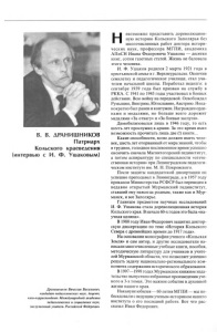 В. В. ДРАНИШНИКОВ Патриарх Кольского краеведения (интервью с И. Ф. Ушаковым) Дранишииков Вячеслав Васильевич, кандидат педагогических наук, доцент, член-корреспондент Международной академии педагогических и социальных наук, заслуженный учитель Российской Федерации. Н евозможно представить дореволюцион ную историю Кольского Заполярья без многочисленных работ доктора истори ческих наук, профессора МГПИ , академика АПиСН Ивана Федоровича Ушакова — десятки книг, сотни газетных статей. Жизнь не баловала этого человека. И. Ф. Ушаков родился 2 марта 1921 года в крестьянской семье в г. Верхнеуральске. Окончив семилетку и педагогическое училище, стал учи телем начальной школы. Поработал недолго: в сентябре 1939 года был призван на службу в РККА. С 1941 по 1945 годы участвовал в боевых действиях. Всю войну на передовой. Освобождал Румынию, Венгрию, Югославию, Австрию. Неод нократно был ранен и контужен. Награжден орде нами и медалями, но больше всего дорожит медалями «За отвагу» и «За боевые заслуги». Демобилизовался лишь в 1946 году, то есть шесть лет прослужил в армии. За это время имел возможность прочитать лишь две (!) книги... Какие способности, волю должен иметь чело век, шесть лет оторванный от мира знаний, чтобы в трудное, голодное послевоенное время успешно окончить сначала Магнитогорский пединститут, а потом аспирантуру по специальности «отече ственная история» при Ленинградском педагоги ческом институте им. М. Н. Покровского. После защиты кандидатской диссертации он успешно преподавал в Ленинграде, а в 1957 году приказом Министерства РСФСР был переведен в недавно открытый Мурманский пединститут, ставший ему навсегда родным, также как и Мур манск, и все Заполярье. Главным предметом научных исследований И. Ф. Ушакова стала дореволюционная история Кольского края. В начале 60-х годов это была «на учная целина». В 1980 году Иван Федорович защитил доктор скую диссертацию по теме «История Кольского Севера с древнейших времен до 1917 года». На основании монографии ученого «Кольская Земля» и сам автор, и другие исследователи на писали многочисленные учебные книги, пособия, методическую литературу для учеников и учите лей Мурманской области, что позволяет успешно решать задачу национально-регионального ком понента содержания исторического образования. В 1997—1998 годах Мурманское книжное изда тельство выпустило избранные произведения уче ного в 3-х томах. Это важное событие в духовной жизни нашего края. Накануне юбилея — 60-летия МГПИ — мы по беседовали с ведущим ученым-историком нашего института о его последней работе. Вот что рас сказал Иван Федорович.